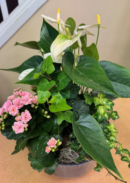 This lovely planter features a blooming anthurium plant with a varigated ivy and kalanchoe in a decorative container. $47.88