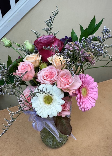 This sweet vase arrangement includes a mix of , spray roses, germinis, a rose, mum and lisianthus in soft pinks, peach, mauves and whites. The flowers are accented with mysty and ruscus. It is arranged to be viewed all the way around and is sure to bring a smile. $69.88