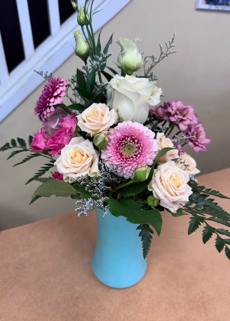 This sweet vase arrangement includes a mix of , spray roses, germinis, a rose, mum and lisianthus in soft pinks, peach, mauves and whites. The flowers are accented with mysty and ruscus. It is arranged in a robin eggs blue vase and arranged to be viewed all the way around. It is sure to bring a smile. $74.88