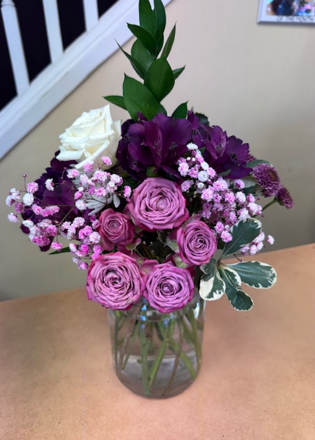 This vase arrangement features an assortment of flowers in mauves, purples, and pinks. The flowers include oriental scented lilies, roses, tulips, alstromeria, and mums . The flowers are accented with mysty and eucalyptus and arranged to be viewed all the way around and displayed in a clear glass vase. Please note that we can substitute the eucalyptus or lilies with other flowers if scent is an issue - just note it in the special remarks box on the order form. $94.88