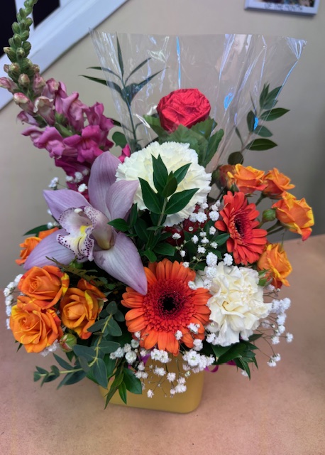 Send some cheer with this bright floral arrangement which include orange spray roses, orange germinis, snap dragon, carnations and ranuncula. It is arranged to be enjoyed from the front and included a tasty belgian chocolate Rose. A sweet touch to already sweet arrangement. $72.88